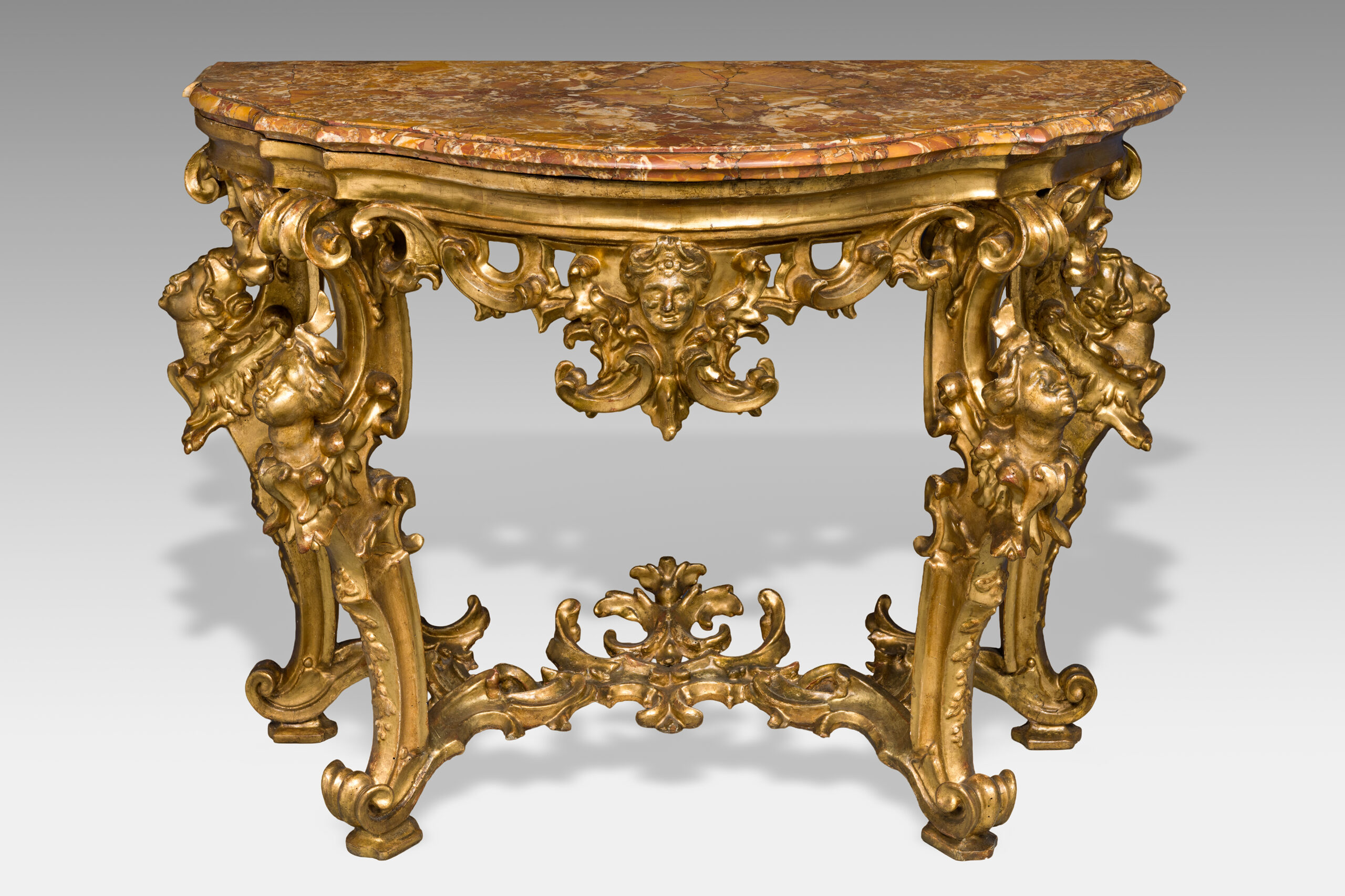 Ricchi decori a volute e motivi vegetali, fascia traforata, gambe mosse riunite da crociera centrata da volute. Piano sagomato e lastronato in marmo profilato in giallo di Siena.